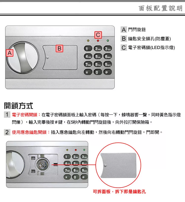 特別推薦本款採機械化上鎖方式、隨時可更改密碼。在緊急情況下可手動鑰匙開門、可選擇3-8位數字密碼設定。附上專用螺絲組,鎖在保險箱底部,可固定於牆壁或櫥櫃中,安全性加分。外觀一體成形鑄造,品質恆久耐用,無論是辦公室、飯店、商店、一般家庭都適用,買了安心多個萬全保障。?